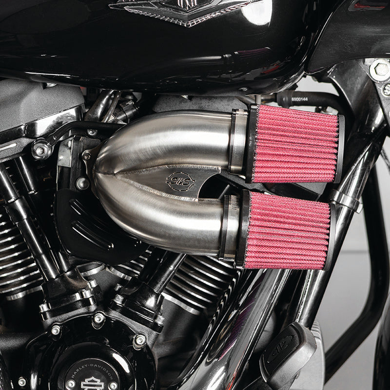 Air flow is everything in a performance engine and naturally it begins at the air filter. Factory units are downright boxy and can be very restricitve. The S&S Cycle Tuned Induction Air Cleaner utilizes two laser cut and highly engineered tubes merged into a single collecter and fed by a pair of high flow air flilters placed directly in the air flow. The end result is maximum performance for your engine and a stylish package.