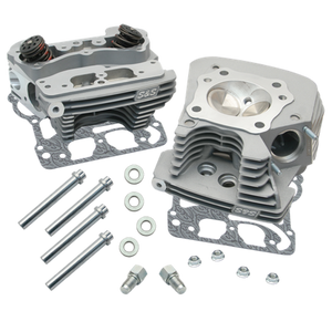 These S&S® Super Stock® high performance cylinder heads are designed for 1999-'05 engines with stock crankcase. They work well with engines of stock displacement, but are ideal for somewhat larger stroker or big bore engines up to 110". The 89cc combustion chamber provides a slightly higher than stock, but still manageable compression ratio in larger than stock engines. This makes them a good choice for touring bikes and other heavy vehicles. The large 2.000" intake and 1.605" exhaust valves maintain port velecity for good low and midrange response, but supply enough air for slightly larger engines to perform to their full potential. S&S® High performance valve springs allow the installation of camshafts with up to .650" lift. Intake ports flow 264 cfm compared to stock heads at 182cfm. S&S® High performance valve springs allow the installation of camshafts with up to .650" lift. Compatible with stock rocker boxes, exhaust, and intake manifolds. Silver powder coat finish matches stock silver engine components.