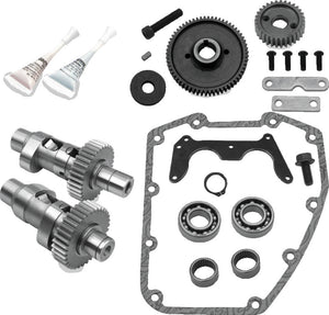 S&S 635GE Easy Start® gear drive camshaft kit for 1999-'06 HD® Big Twins except '06 HD® Dyna® are recommended for modifed engines with larger displacement and higher compression. More torque and horsepower than bolt in cams can deliver. Requires high lift springs in all applications. An S&S oil pump and cam support plate, along with a stock 2007 and later style hydraulic cam chain tensioner upgrade is highly recommended for chain drive cams.
