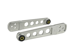 Skunk2’s Clear Anodized Rear Lower Control Arms for the ’01-’05 Civic are based off of the same technology the company’s been using on its own race cars for more than a decade and are a must-have for enthusiasts looking to fine-tune their suspension for maximum handling performance. Skunk2’s Rear Lower Control Arms are direct replacements, maintain OEM suspension geometry, and are ideal for street and race applications. Each arm is forged from aircraft-quality 2024 billet aluminum, precision CNC-machined, and is more than 25 percent lighter than the OEM arms. Skunk2 Rear Lower Control Arms also feature adjustable anti-sway bar mounting holes for advanced suspension tuning and optimum balance. The low-deflection, polyurethane bushings act as bearings for quicker response and a more positive feel. Skunk2 also eliminated tearing and un-seating problems typically associated with other fixed rubber bushings by allowing the arm to rotate freely about the bushings. Properly designed suspension components must be strong and functional first and aesthetically pleasing second. Skunk2’s Rear Lower Control Arms are both. Each arm’s I-beam shape and tapered design is a direct result of efforts to eliminate twisting, bending, and stress risers. Extensive FEA (finite element analysis) testing determined that conventional “straight and flat” designs are plagued by internal stress risers. A poorly designed arm will concentrate stress in particular zones, causing the arm to fracture and ultimately fail. For maximum suspension performance, Skunk2 Rear Lower Control Arms are best complemented with Skunk2 Rear Camber Kits, Lower Arm Bars, and Strut Tower Bars.
