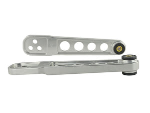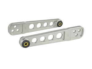 Skunk2’s Clear Anodized Rear Lower Control Arms for the ’02-’06 RSX and 03-08 Element are based off of the same technology the company’s been using on its own race cars for more than a decade and are a must-have for enthusiasts looking to fine-tune their suspension for maximum handling performance. Skunk2’s Rear Lower Control Arms are direct replacements, maintain OEM suspension geometry, and are ideal for street and race applications. Each arm is forged from aircraft-quality 2024 billet aluminum, precision CNC-machined, and is more than 25 percent lighter than the OEM arms. Skunk2 Rear Lower Control Arms also feature adjustable anti-sway bar mounting holes for advanced suspension tuning and optimum balance. The low-deflection, polyurethane bushings act as bearings for quicker response and a more positive feel. Skunk2 also eliminated tearing and un-seating problems typically associated with other fixed rubber bushings by allowing the arm to rotate freely about the bushings. Properly designed suspension components must be strong and functional first and aesthetically pleasing second. Skunk2’s Rear Lower Control Arms are both. Each arm’s I-beam shape and tapered design is a direct result of efforts to eliminate twisting, bending, and stress risers. Extensive FEA (finite element analysis) testing determined that conventional “straight and flat” designs are plagued by internal stress risers. A poorly designed arm will concentrate stress in particular zones, causing the arm to fracture and ultimately fail. For maximum suspension performance, Skunk2 Rear Lower Control Arms are best complemented with Skunk2 Rear Camber Kits, Lower Arm Bars, and Strut Tower Bars.