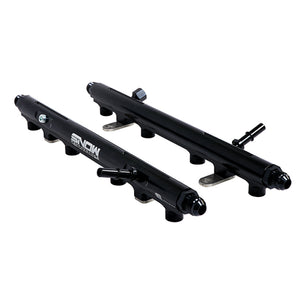 If youre looking for cheap "universal" style fuel rails with crappy mounting brackets that allow fuel leaks, this product is not for you! If youre looking for the best fuel rails on the market, you have come to the right place. Snow Performance Fuel Rails are designed and built in the USA from the highest quality components available. Snow fuel rails are CNC machined for a perfect fit and are anodized in black for the ultimate in looks and corrosion resistance. Snow fuel rails utilize high-strength stainless-steel mounting brackets to ensure the rails stay in place and do not leak in high-pressure conditions. Snow rails are ready to flow as much fuel as your engine needs, made for use with 8AN ORB fittings in the inlets/outlets of the rails there is no need to worry about fuel leaks or flow restrictions. These rails also incorporate two 1/8-NPT ports in each rail for gauges, sensors, or fuel fittings to feed your nitrous system with no additional fittings required. These fuel rails fit 2011-2017 Mustang and F150's with the following Coyote manifolds: 1st Gen GT (2011-2014) 2nd Gen (2015-2017) 3rd Gen (2018-Up) (When retro-fitted to an 11-17 engine) Boss 302 GT350 Cobra Jet All Coyote truck intake manifolds. Kit includes: Two Billet Fuel Rails Four 1/8-NPT Plugs Two 8AN Inlet/Outlet Fittings One 8AN ORB Plug Mounting Brackets for Factory Height Coyote Injectors 8AN to 8AN ORB 90 degree Swivel Fitting 8AN to 3/8 (10mm) Fuel Line Adapter 8AN PTFE Fuel Feed Hose Pre-Made 8AN PTFE Crossover Hose Rails are designed to work with a stock height injector (60mm). Shorter injectors can be used in conjunction with Snow Performance injector spacers (available separately) to make the overall mounting height of the injector 60mm.