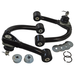 Improve droop travel, drivability and tire wear as well as adjusting tire position in your wheel well with SPC's adjustable front upper control arms on many Toyota trucks and SUVs. Featuring our long life maintainable ball joint and SpecRide bushings, this arm is designed to correct alignment angles while maintaining factory ride quality. SPC's integrated tubular and cast steel design provides the strength and durability needed for the most demanding environments. These remove and replace arms are available in pairs for lifted and off-road applications. Get more droop travel: SPC's arm has improved clearance to get around the spring bucket when the arm droops, eliminating arm to frame contact on lifted trucks. The maintainable ball joint has an oversized ball and allows more than 80deg of articulation to ensure it never binds. SpecRide bushings have free pivot to eliminate any chance of bushing failure seen on many high travel suspensions. Get your drivability and tracking back: When you lift your truck you affect caster and camber. SPC's arms have +1deg of caster built into them. Using its patented ball joint design the arm will get you 0deg to +4deg of caster and +-2deg of camber. Get your tire where you want it in the wheel well: Use adjustment in the control arm and on the OE lower cams to maximize alignment angles and move oversized tires forward in the wheel well to minimize or avoid fender trimming. Do you need replacement cams for the lower control arm? Check out SPCp/n 25445, which will replace corroded cam bolt assemblies. * On the adjustable ball joint SPC uses hex chromate free finish and offers a 700hr salt spray finish for the best corrosion protection available. California Residents WARNING