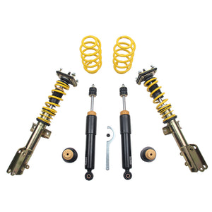 Looking for maximum performance for your car? Our adjustable ST XTA Coilover kits are the upgrade you need. All ST XTA systems are delivered with a linear race springs system, adjustable dampers, and aluminum unibal camber adjustable top mounts. ST XTA Coilover kits deliver precise adjustment to your ride height so you control the look of your car. We manufacture the adjustable spring perch made of durable and friction-optimized polyamide composite material with a stainless steel insert. Thanks to the composite material corrosion is prevented between the strut and perch ensuring long lasting height adjustability while the stainless steel insert provides strength and confidence! ST XTA Coilovers come preset to our factory recommended damper settings, the same configuration we test them at on our KW shock dynos before they go into your box. The 16 distinct clicks of adjustable rebound damping allow you to refine the driving dynamics with a simple turn of the adjustment knob. Each kit includes a detailed damper setup manual making it easy to reset to our recommended setting at any time. Whether your preference is comfort, performance, or something in between; ST XTA puts the finer details of the driving dynamics in your hands. The top mounts included with our ST XTA Coilover kits allow you to adjust the camber at the front axle to dial in aggressive wheel and tire fitment. They also allow you to maximize the tire's contact patch for driving in fast corners and any other driving scenario that demands maximum grip. Galvanized zinc coated steel struts optimize corrosion protection for long lasting use. We add a dust protection system to prevent unwanted dirt and particulate from coming in contact with the hardened chrome piston rod or getting into the valve packs. We reinforce the system with a multi-layered pressure resistant sealing package, mono block guide system and a low friction piston band which works inside the pressure resistant internal damper housing.