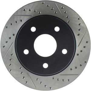 StopTech Drilled and Slotted Sport Rotors are 1-piece direct replacement brake discs for factory brake systems and stock calipers that look great behind your wheels – and offer significantly improved braking performance. The unique cross-drilling and slotting aids with heat and brake dust dispersal; prevents glazing of the pads; adds bite and improves wet and dry braking performance. Built to last; the black e-coating provides protection from corrosion and the high carbon metallurgy (in most applications) offers quieter operation; better crack resistance and increased performance. Warranty
