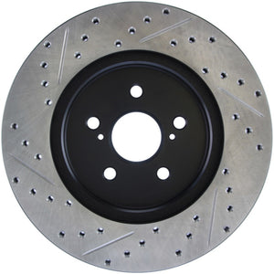 StopTech Drilled and Slotted Sport Rotors are 1-piece direct replacement brake discs for factory brake systems and stock calipers that look great behind your wheels – and offer significantly improved braking performance. The unique cross-drilling and slotting aids with heat and brake dust dispersal; prevents glazing of the pads; adds bite and improves wet and dry braking performance. Built to last; the black e-coating provides protection from corrosion and the high carbon metallurgy (in most applications) offers quieter operation; better crack resistance and increased performance. Warranty