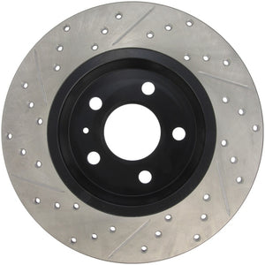 StopTech Drilled and Slotted Sport Rotors are 1-piece direct replacement brake discs for factory brake systems and stock calipers that look great behind your wheels – and offer significantly improved braking performance. The unique cross-drilling and slotting aids with heat and brake dust dispersal; prevents glazing of the pads; adds bite and improves wet and dry braking performance. Built to last; the black e-coating provides protection from corrosion and the high carbon metallurgy (in most applications) offers quieter operation; better crack resistance and increased performance. Warranty