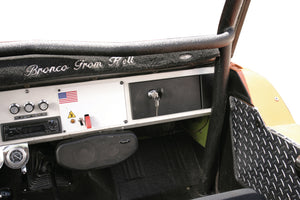 This steel glove box is specifically designed for the early Bronco. It is an ideal replacement for the factory glovebox with the added security of Tuffy’s patented Pry-Guard II locking system. Tuffy’s Patented latch system allows the glovebox to be latched shut without having to be locked and unlocked each time it is accessed. The glovebox features a split lid to accommodate a full roll-cage.