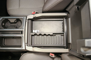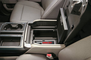 Continuing the Tuffy legacy of designing and manufacturing the finest console safes in the industry since 1997, Tuffy is proud to introduce our new line-up of console safes for full size trucks beginning with the 2015 plus Ford F-Series flow-through center security console safe. It maintains a completely stock look including full use of the factory accessory tray, armrest and lid. Featuring a durable texture powder coat finish, the safe comes ready to install in just a few minutes without drilling. Installation Instructions