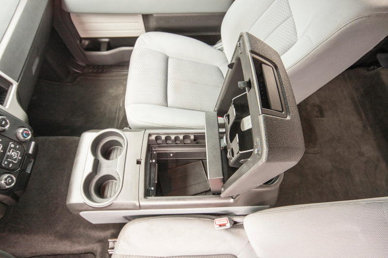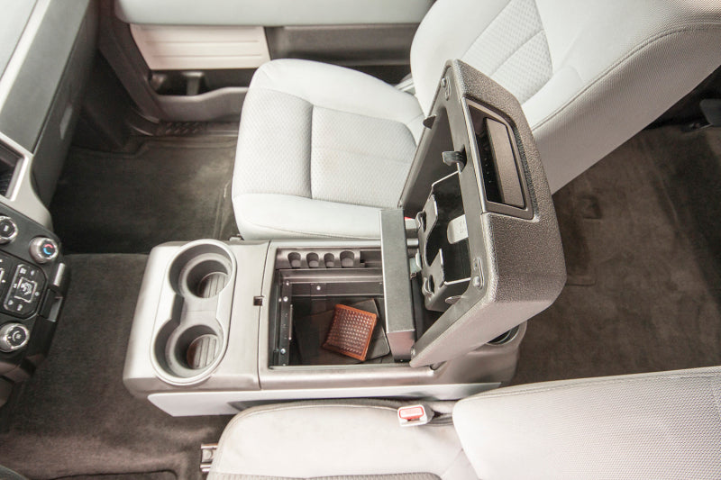 Continuing the Tuffy legacy of designing and manufacturing the finest console safes in the industry since 1997, Tuffy is proud to introduce our Security Console Insert for the Ford F-150 XLT with full center console and column shift. This 16 gauge steel console safe provides style, security and convenience. While maintaining the refined curves of the OEM console, the Tuffy console safe transforms your OEM console into a heavy-duty lockable storage area utilizing Tuffy’s Pry-Guard locking system with 10 tumbler double bitted security key to help protect valuables from thieves. The Tuffy console safe provides access to optional OEM USB and power outlets inside the console utilizing an exclusive lid support feature that keeps the lid open while accessing contents. It maintains a completely stock look, armrest and lid. Featuring a durable texture powder coat finish, the safe comes ready to install in just a few minutes without drilling.