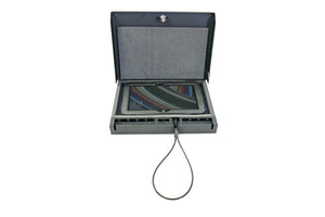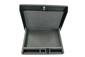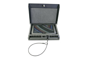Weighing less than 7 lbs., this lockable welded steel storage box is designed to secure a tablet or firearm and protect valuables while carrying by hand between locations, during travel, inside a vehicle, home or office. Convenient pre-drilled holes allow for easy mounting to solid surfaces including airline cockpits, fleet & service vehicles, home or office environments. Access ports are built in to accommodate power and data transfer cables. Exclusive lid restrictor hinge stop design prevents lid from dropping open when mounted to a solid surface and can be quickly removed to open the lid fully when on the go. The lid restrictor kit allows either 3 inch or 5 inch lid opening, if desired. Keyless entry is provided by Tuffy’s 3 digit combination lock with a two-point steel cam for added security. The included 2 ft. long, 2000 pound test, steel security cable secures the safe to any sturdy mounting surface by attaching to the 1/8 inch steel security cable anchor point. The inside is lined with low-density foam to protect the contents, while compression bumpers keep the lid vibration-free when closed.