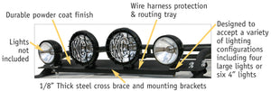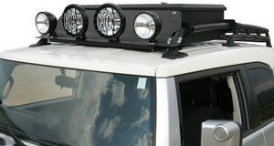 This stylish and functional light bar assembly mounts to the OEM factory roof rack on an FJ Cruiser. Is designed to accept four large lighting systems or six 4 inch lighting systems. A protective tray conceals and routes the wiring harnesses. Constructed using powder coated 1/8 inch thick steel. Lights not included. Installation Instructions