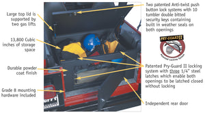 This heavy duty, high security, 16-gauge steel trunk mounts in place of the rear seat. The lockable trunk is great for tools, camping gear, equipment, and much more. The trunk can be accessed through the large top lid, or through the independently opened rear door. A unique hinge design allows the Lockbox to be flush mounted without affecting hinge operation. Installation Instructions