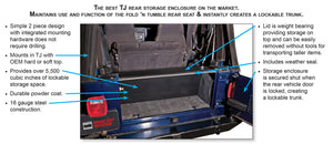 This tailgate security enclosure is a simple, one-piece hinged design that creates a lockable storage area completely protected on all sides. The patented design works in conjunction with the lockable vehicle tailgate and the existing vehicle geometry to secure the area created without the need for a rigid panel connection, any releasable lock mechanisms or other unnecessary hardware. The innovative design eliminates the burden of having to bolt a bunch of panels together. The enclosure maintains the use and function of the rear seat. Quickly and easily installs using standard hand tools in conjunction with an OEM hardtop or soft-top. The assembly removes easily to allow for storage of larger items. On Jeep Wrangler TJ vehicles, the rear tailgate lock must be locked manually with the Jeep key in order for the Tuffy enclosure to function as a secure storage device. Installation Instructions