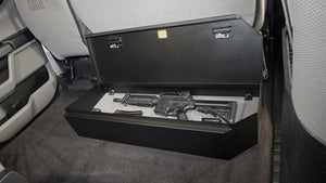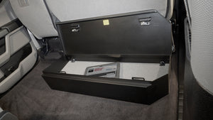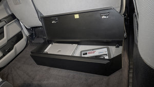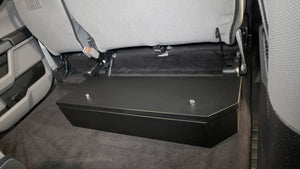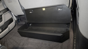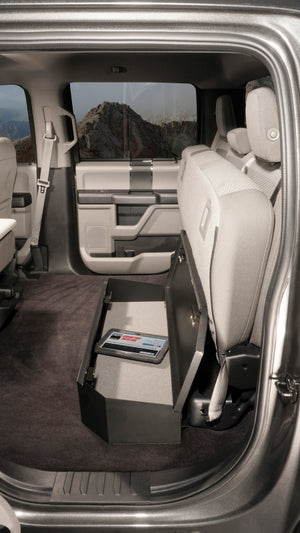This high security welded steel security lockbox mounts under the rear 60 percent bench seat in your 2015-2024 Ford F-150 or 2017-2024 Ford F-250/F-350/F-450 Super Duty SuperCrew truck. The three-fifths width formfitting design of the Tuffy lockbox has over 3800 cubic inches of lockable storage while leaving room for an aftermarket sub-woofer or other gear under the rear passenger side seat. Its secured contents are easily accessed by flipping the 60 percent rear bench seat up and lifting the lid. The unique design allows the space beneath the 60 percent bench seat to be used to stow firearms or other long items securely. This lock box comes with Tuffy's Pry-Guard Locking System and three-digit combination security locks with built in weather seals. Chamfered corners are incorporated into the design for easier passenger access and a more concealed form factor. The innovative mounting system is accessed from inside the box. Installation Instructions
