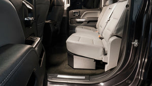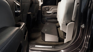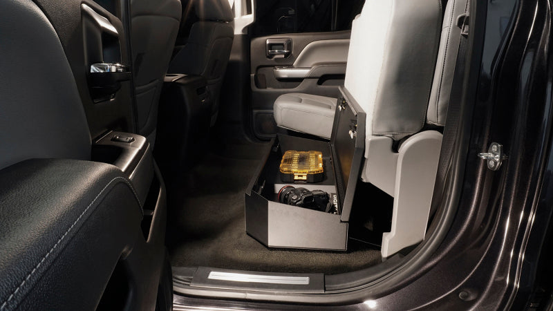 This high security welded steel security lockbox mounts under the rear 60 percent bench seat in your 2007-2018 Chevrolet/GMC 1500 or 2007-2019 Chevrolet/GMC 2500 HD/3500 HD Crew Cab truck. The three-fifths width formfitting design of the Tuffy lockbox has over 2100 cubic inches of lockable storage while leaving room for an aftermarket sub-woofer or other gear under the rear passenger side seat. Its secured contents are easily accessed by flipping the 60 percent rear bench seat up and lifting the lid. The unique design allows the space beneath the 60 percent bench seat to be used to stow firearms or other long items securely. This lock box comes standard with Tuffy's Pry-Guard Locking System and a 10 tumbler double bitted security lock with built in weather seals. Chamfered corners are incorporated into the design for easier passenger access and a more concealed form factor. The innovative mounting system is accessed from inside the box. Installation Instructions