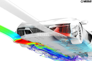The Verus Engineering Control Arm Guide Strakes were developed to improve the aero balance of the C8 Corvette. By creating strong vortices in a dirty area of the underbody the Control Arm Guide Strakes are able to reduce drag and increase the downforce generated by working the underbody of the Corvette harder. On a vehicle equipped with our Splitter, Swan Neck UCW Rear Wing, and Rear Diffuser, these simple and effective strakes increased total downforce by 3% with no increase in drag. More importantly, they shift the aero balance forward by 4.5%, allowing the end user to dial in more angle of attack on a rear wing. This means more downforce for the same aero balance!