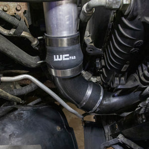 The 3.5" High Flow Intercooler Outlet Elbow for 2006-2010 LBZ/LMM Duramax replaces the factory plastic piece pipe with a high flow, 14 ga. aluminum fabricated 3.5" pipe. This part uses a CNC machined flange with a double o-ring seal, comes supplied with a new wire clip ring, and uses an upgraded silicone reducer boot with stainless steel t-bolt clamps to withstand higher boost pressures than the factory components to increase reliability and eliminate blown factory boots and horsepower robbing boost leaks. Finished in your choice of custom powder colors to match your existing WCFab products.