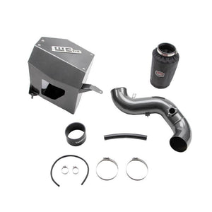 2010-2012 6.7 Cummins 4" Intake Kit with Air Box for OEM / VGT Turbocharger. This high flow, fabricated aluminum intake pipe and air box enclosure with dry filter assembly replaces the restrictive plastic factory parts on your diesel for improved engine performance. All new design significantly increases air flow to your turbo producing improved horsepower and torque, quicker throttle response, and cooler intake temperatures by drawing cold air through the inner fender. All aluminum construction features large diameter 4" piping with smooth aerodynamic bends to improve intake air velocity, volume, and provide more aggressive engine and turbo sound during acceleration. High quality hardware, silicone boot, seals, and stainless steel t-bolt clamps ensure optimum durability and ease of installation. Removable air box lid element allows for easy visual inspection and maintenance of your WCFab filter with included hydrophobic pre-filter cover, to help keep your MAF sensor, turbo, and engine airways contaminant free. Full assembly finished in your choice of WCFab's signature custom powder coat colors for a look as unique as your truck. Made in USA. Air box is NOT compatible with intake pipe from kit WCF100863.
