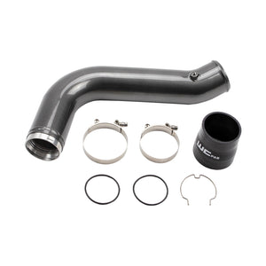 The WCFab 3.5" High Flow Passenger (Cold) Side Intercooler Pipe for 2017-2019 L5P 6.6L Duramax equipped Chevrolet Silverado or GMC Sierra 2500 / 3500 HD truck replaces the factory plastic two piece pipe with a high flow, 14 ga. aluminum one piece 3.5" pipe. - - This part uses a CNC machined flange with a double o-ring seal and an upgraded silicone boot in order to withstand higher boost pressures than the factory components to increase reliability and eliminate blown factory boots and horsepower-robbing boost leaks. This pipe is compatible with stock trucks requiring no additional modifications, upgrades, or tuning for installation. - - Replaces the following GM Part Numbers: 84189332 Installation Instructions
