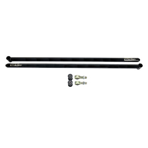 Traction bars are a necessary upgrade when increasing the horsepower on your truck to prevent the axle from twisting which can lead to broken u-joints, driveshafts, and even twisted axle housings. These Universal Fabricator Series 68" Traction Bars from WCFab include the essentials, allowing you to customize the mounts for your specific application. Features High quality RockJock rebuild-able and grease-able Johnny Joint heim connections at the frame side connection for the bars. Heavy Duty Poly Urethane Bushing at the axle side connection for decreased noise and vibration (common complaint when solid heims are used on both ends). WCFab traction bars are all finished with their professional in house powder coat process in your color choice and come standard with a epoxy primer base coat before the final color to increase corrosion resistance by more than ten times compared to just your standard powder single coat application. Made in USA.