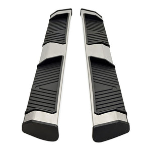 AT6 Running Boards are designed for full size trucks and feature a 5-inch wide step area with integrated indented pads for solid footing. Built with clean, rounded end caps and bracket covers for an OEM?style appearance, they offer a refined yet rugged look. Two finish options are available, textured black powder-coated extruded aluminum, backed by a 3?year limited warranty, or bright finish polished stainless steel with a limited lifetime warranty. These boards are lightweight but structurally durable, designed to minimize added weight with the strength for the toughest jobs. The footboard and pads are ergonomically placed for comfort and maximum traction. Bracket covers are used to conceal mounting hardware and help preserve that clean factory look. The AT6 models are vehicle-specific fit and include hardware to bolt on the boards with no drilling required. Installation takes about 1.5hrs, and depending on the height of the truck, should not require a lift. The aluminum construction offers excellent weather resistance with proper care and maintenance, but for harsh road conditions or regions where salt is used on the roadways during winter, choose stainless steel. Replace your factory running boards with AT6. They are a sleek, solidly built option with stylish design, ample stepping area, and finish choices for a custom look.